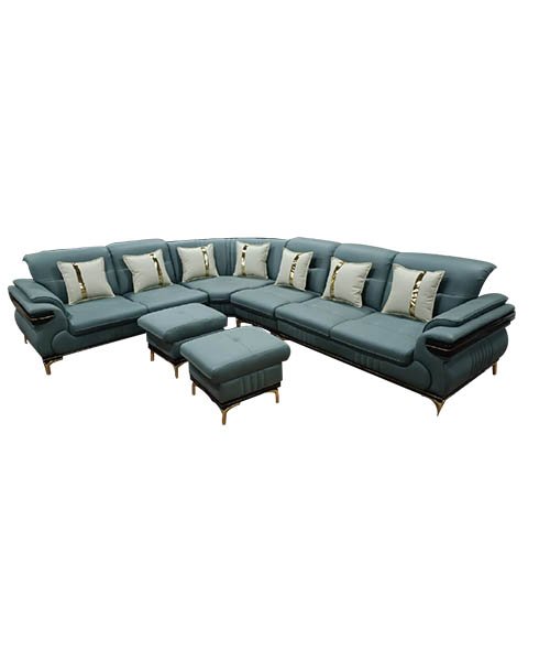 Transform your living space into a luxurious lounging zone with the 7 Seater L Shape Sofa Set LS-03. This spacious L-shaped sectional is designed for large families or social households, offering both style and substance in one sophisticated package. With its rich teal hue and gold-accented legs, it brings a modern yet classy charm to any interior.
